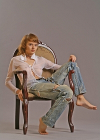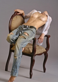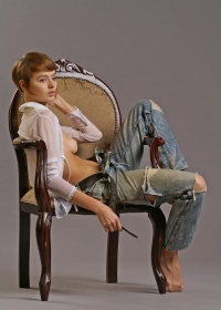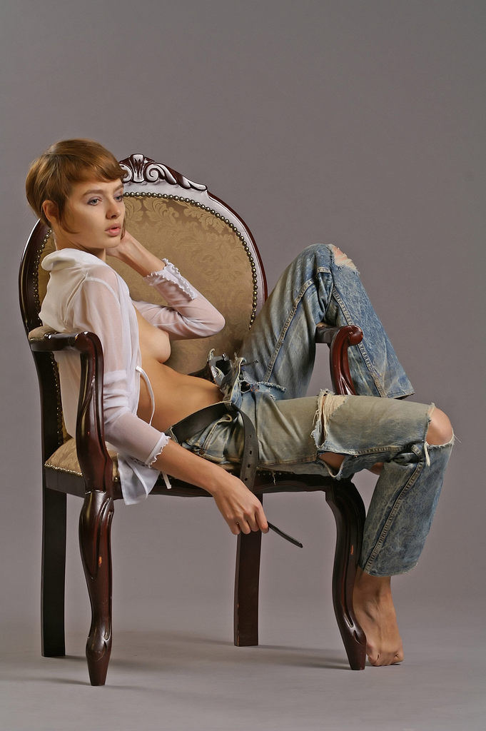 Teen redhead girl poses wearing cool jeans before hotly undressing and showing cute boobies, shaved pussy