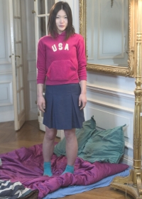 Skinny Asian brunette takes off her clothes to show hairy pussy on camera