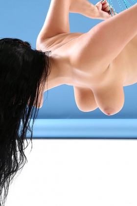 Flexible brunette with big boobs opens her shaved pussy and fills sweet hole with her talented fingers