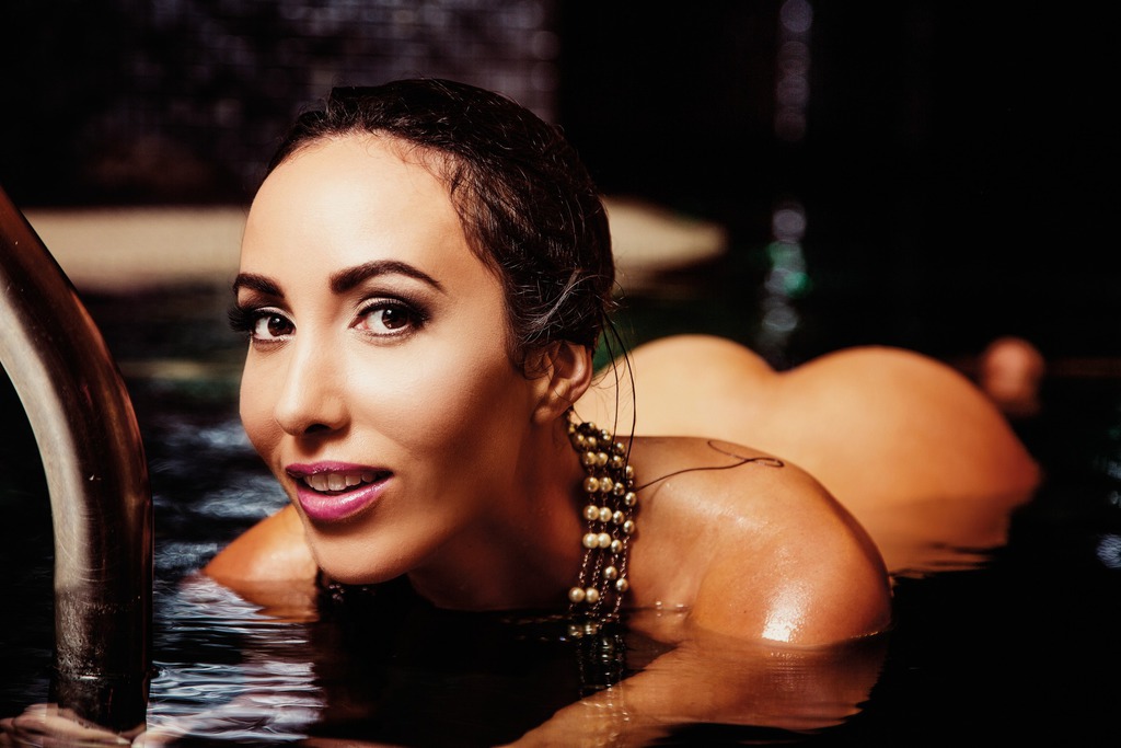 She looks amazing naked, but her big tits look even better when she gets them wet in the pool.