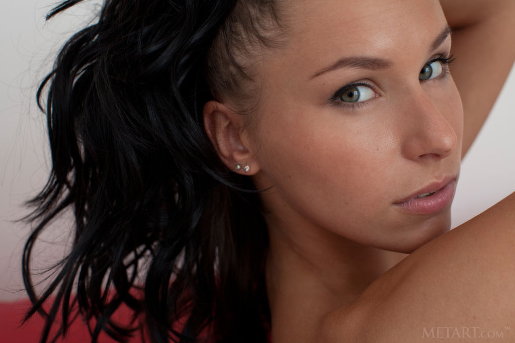 Skinny babe lies down on red couch and later on the floor to open pussy, as well as to masturbate