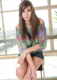 Wonderful brunette wearing short jeans is showing striptease and solo skills