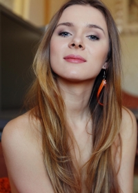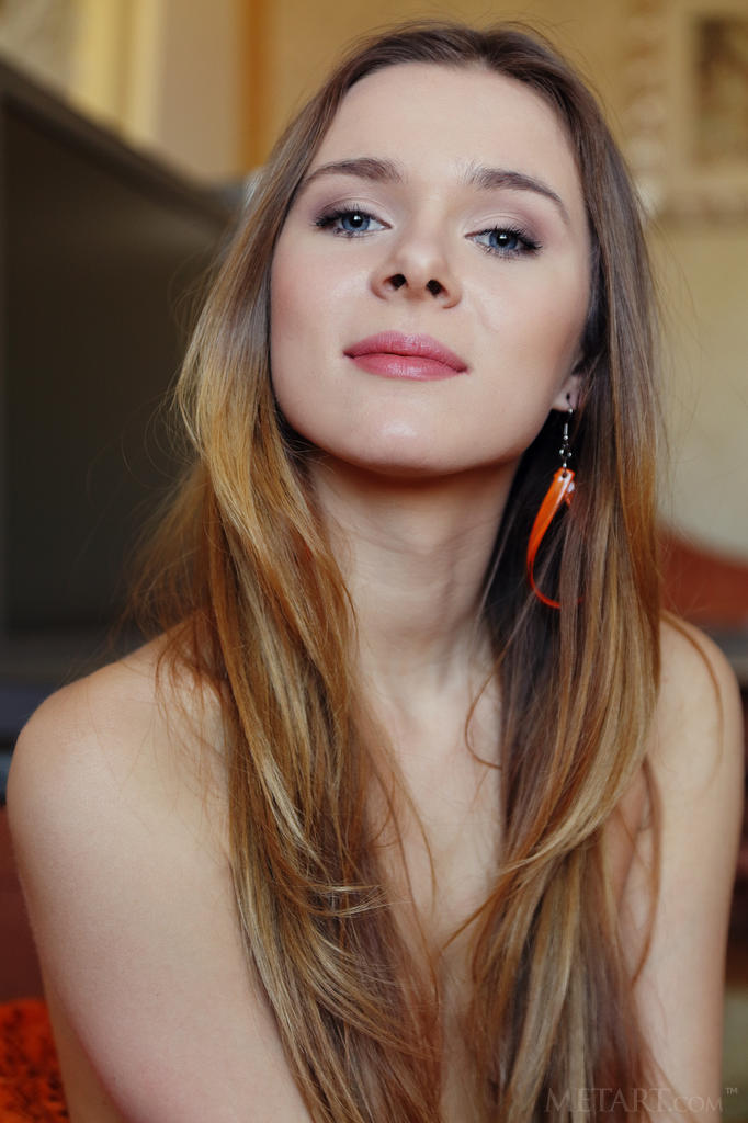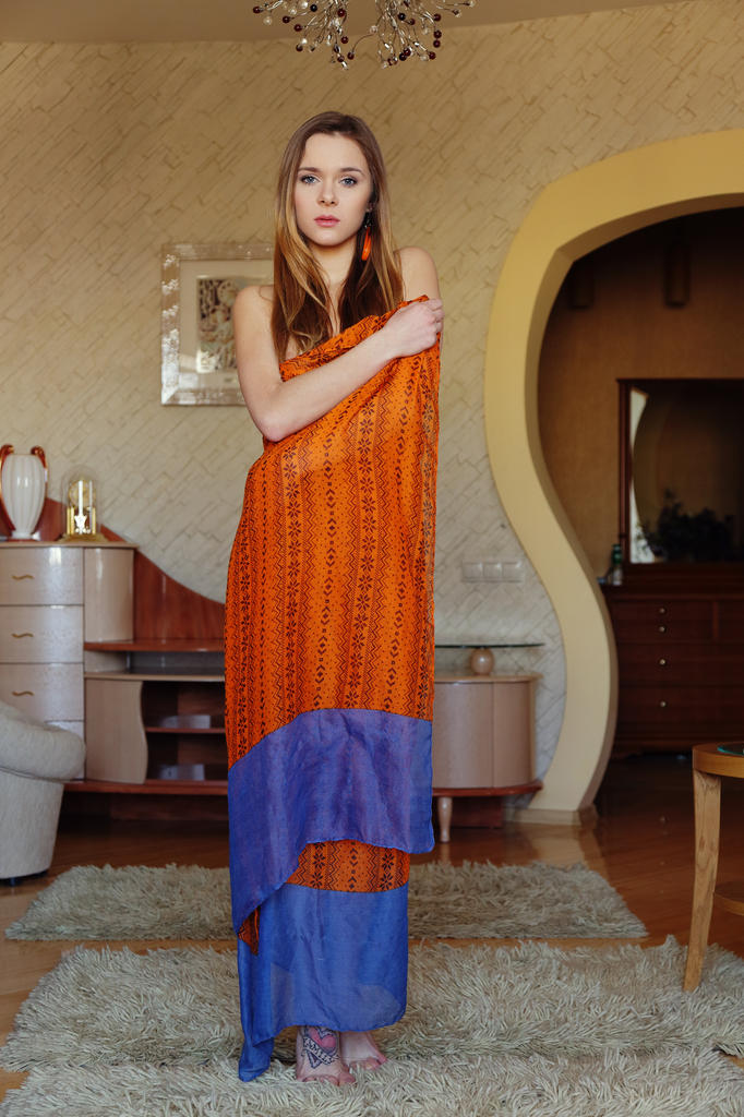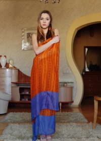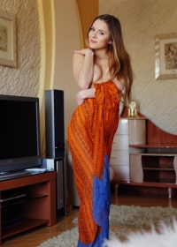Busty babe having pretty face and wearing long colorful dress is showing her solo skills