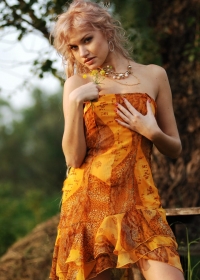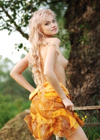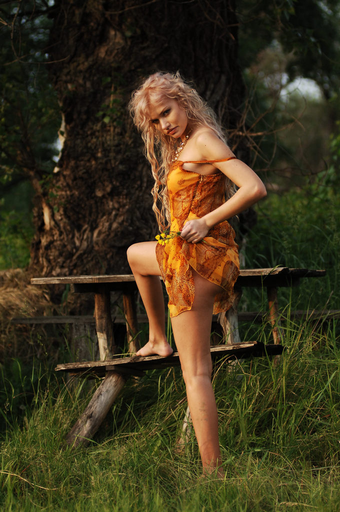 Slim blonde babe gets rid of her clothes on a bench in the middle of the forest