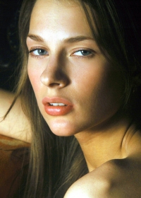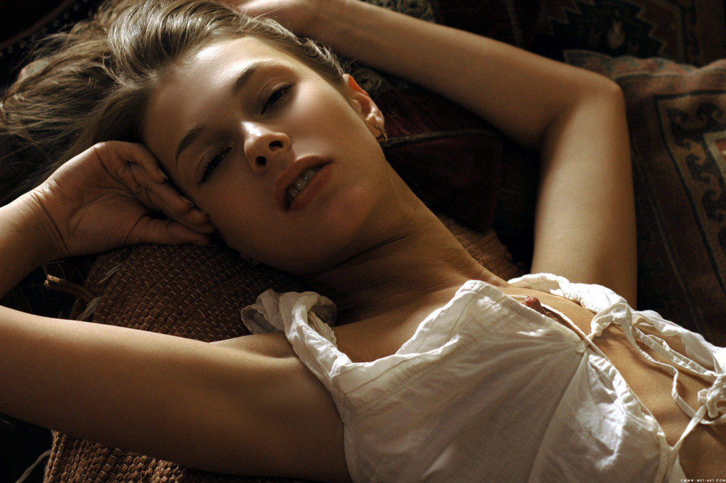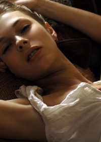 Gentle brunette bares her yummy boobs as well as her clean shaved pussy on the couch
