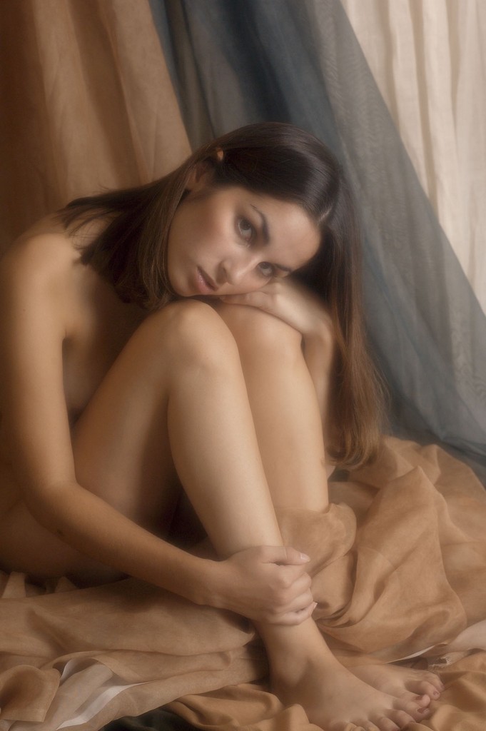 Slim babe poses totally naked to show the beauty of her yummy boobs and shaved pussy