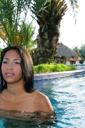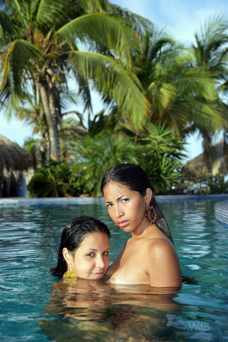 Two best lesbian girlfriends swim naked in the outdoor pool and even caress each other