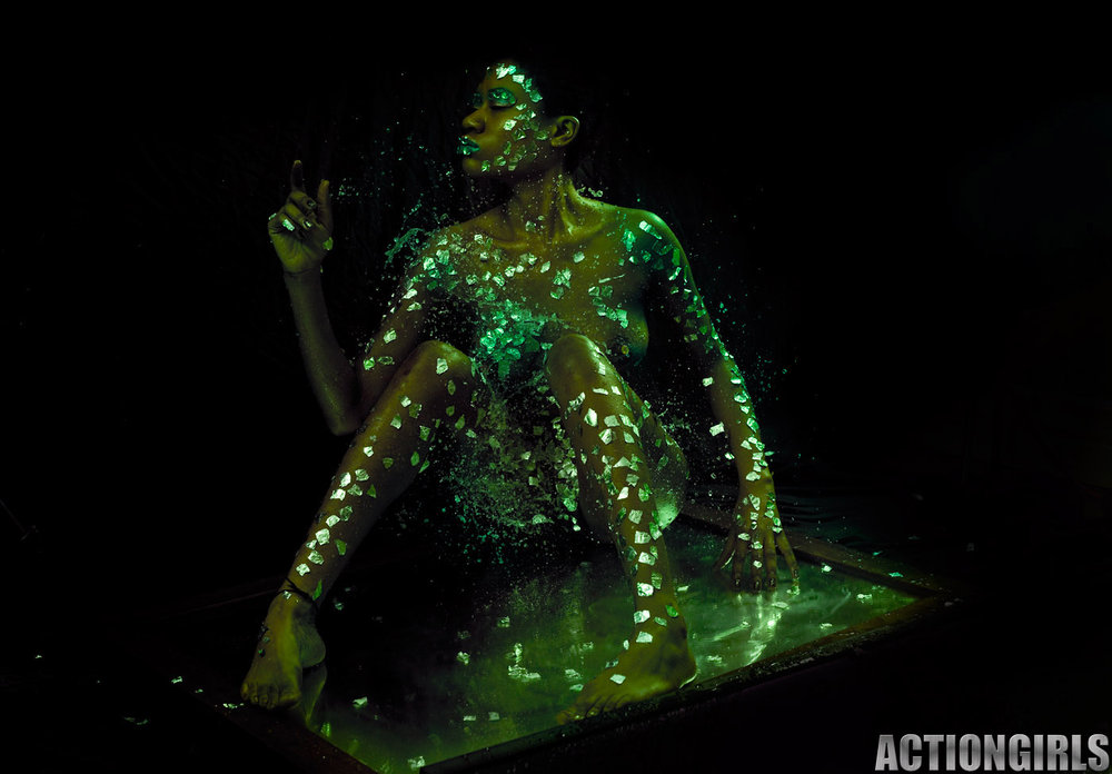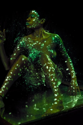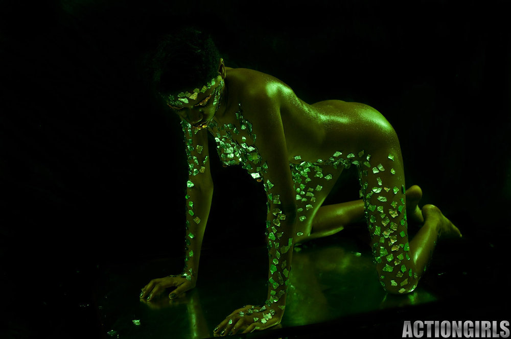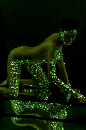 Busty babe covers her gorgeous body with a fluorescent paint to pose on camera