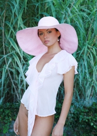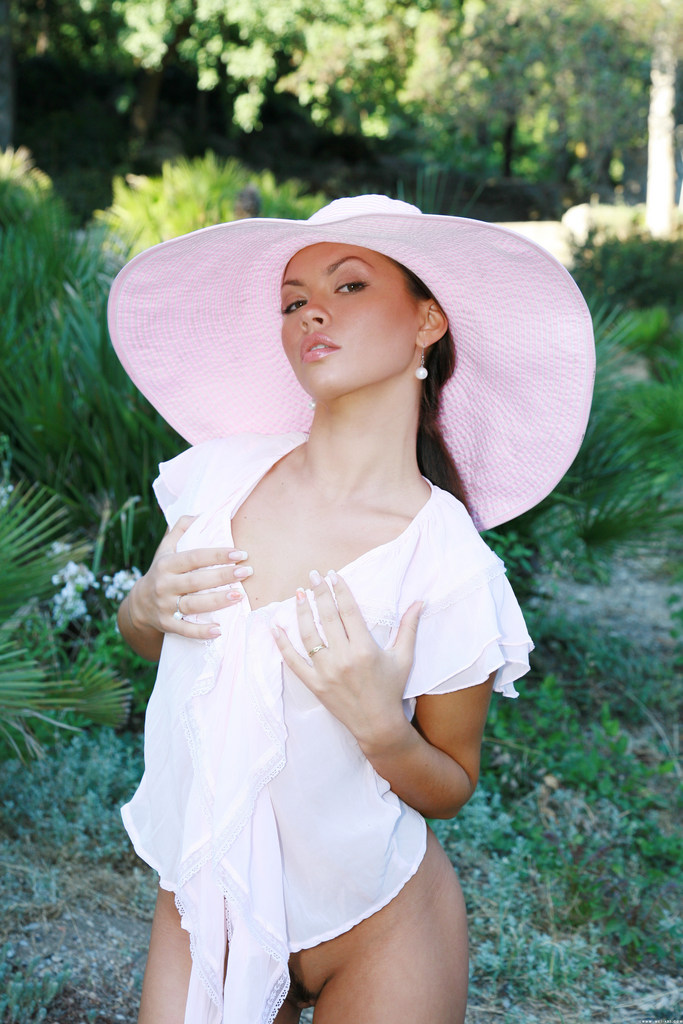 Busty brunette wearing white clothes and pink hat is touching herself outdoors