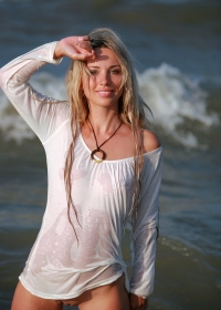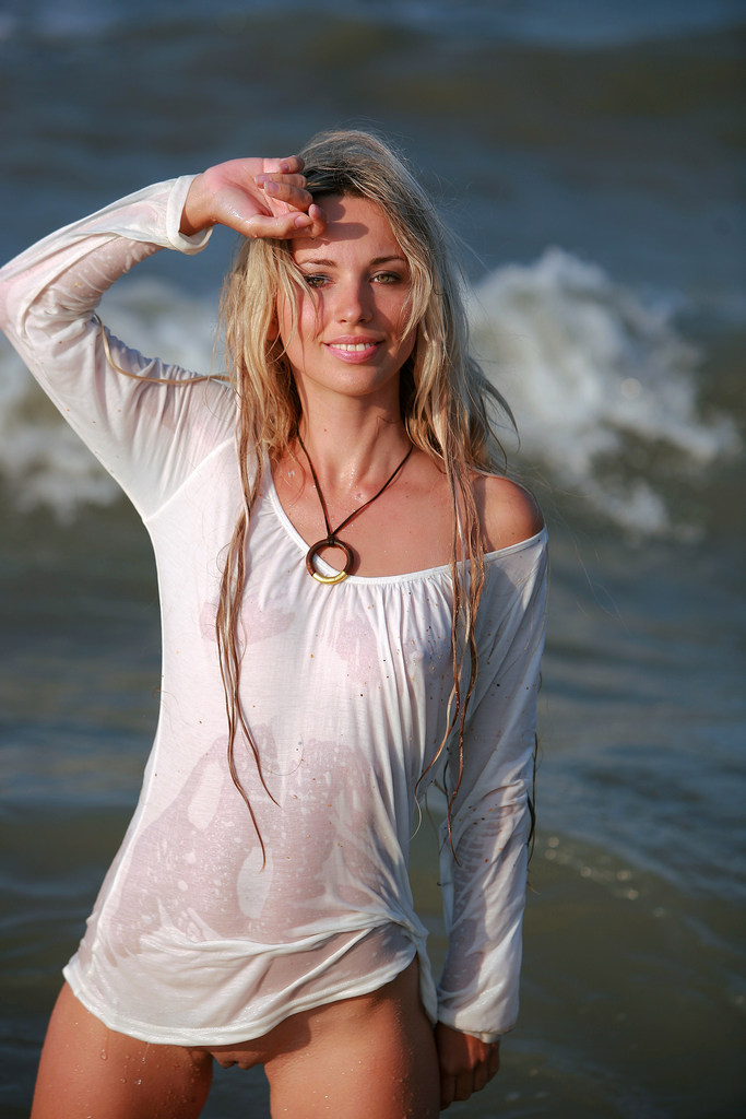 Good-mannered mature mom playing naked on beach water while fondling gently and sensually