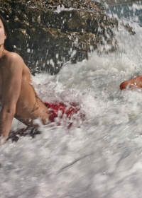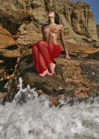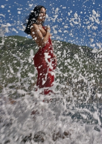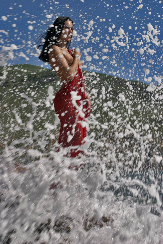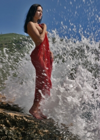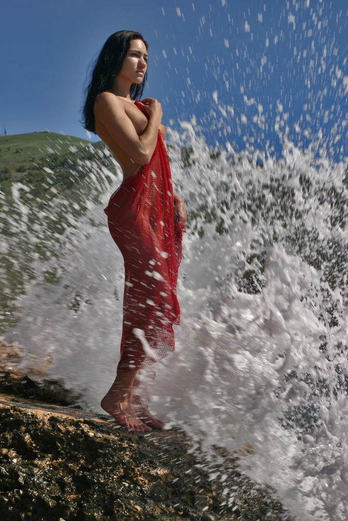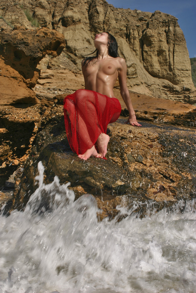 Slim dark-haired babe goes for a walk at the seaside and even poses in the waves.