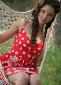 Slim brunette takes off clothes to relax naked in the hammock on a hot summer day