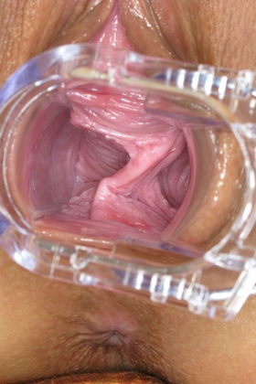 Using a speculum, this smoldering hot babe spreads her shaved pussy wide open.