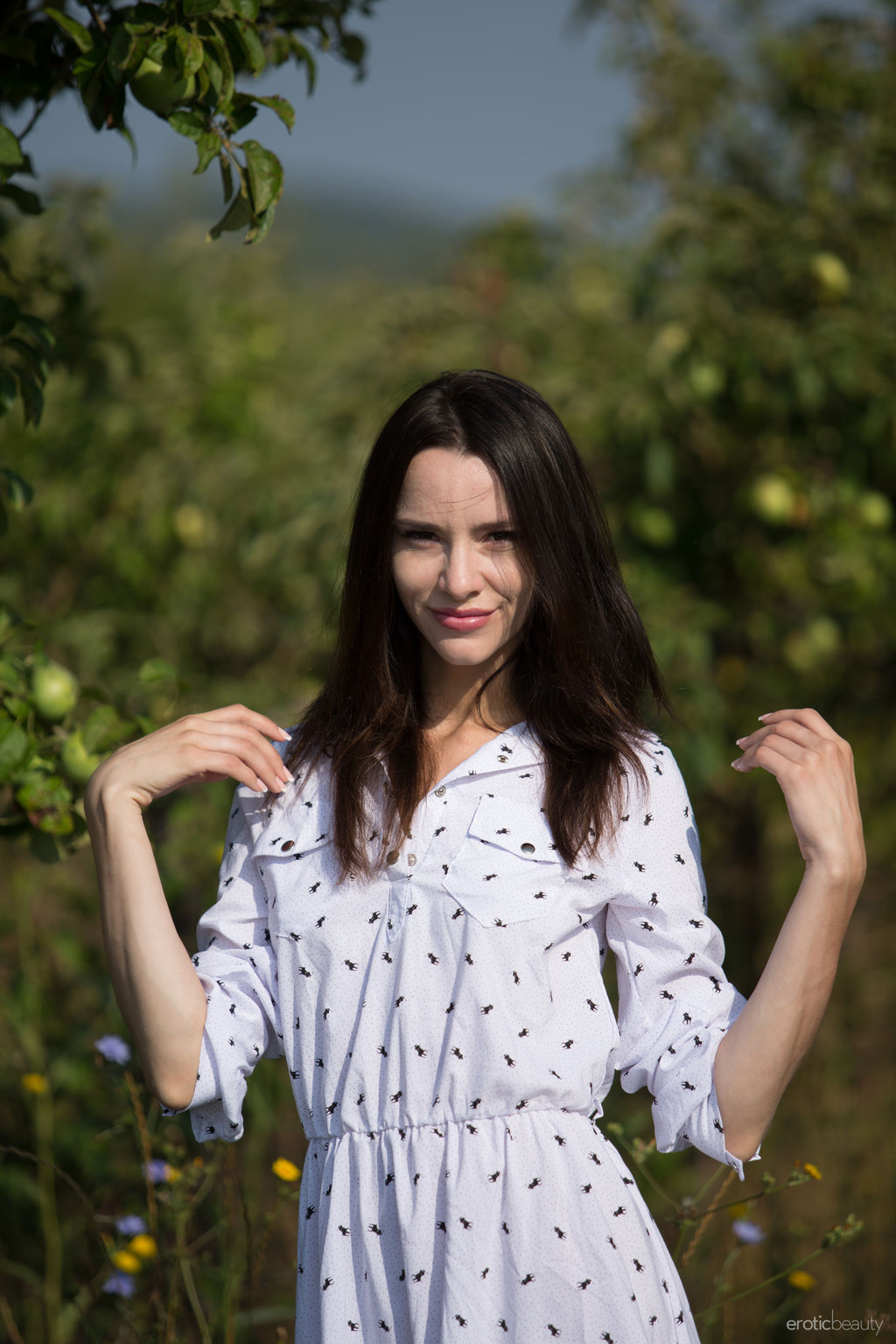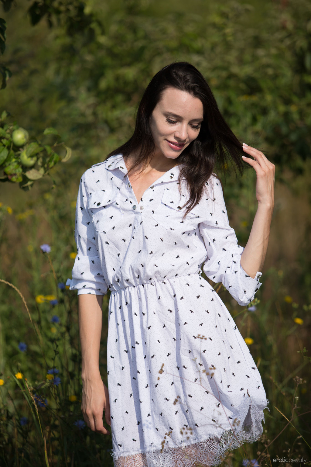Modest brunette goes for a walk in the meadows to reveal her naughty nature.