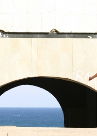 Totally naked babe goes for a walk at the sea-front together with a photographer.