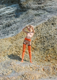Hot blonde in orange stockings and garter belt spends a day under warm rays of sun