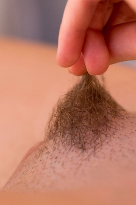 She has so much fun getting out of her short, jean shorts and playing with her hairy pussy.