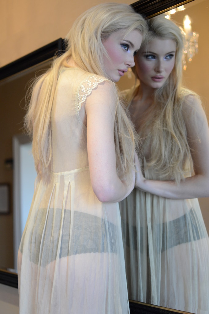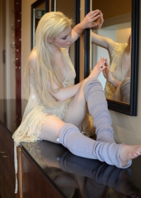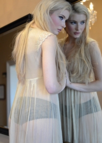 Stripping off her very sexy nightie, this hot blonde spreads out on her dresser.