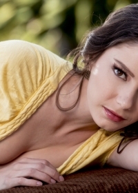 Wonderful brunette wearing yellow dress is getting naked and touching herself outdoors