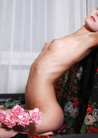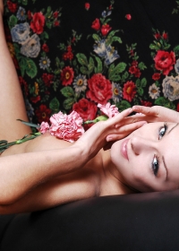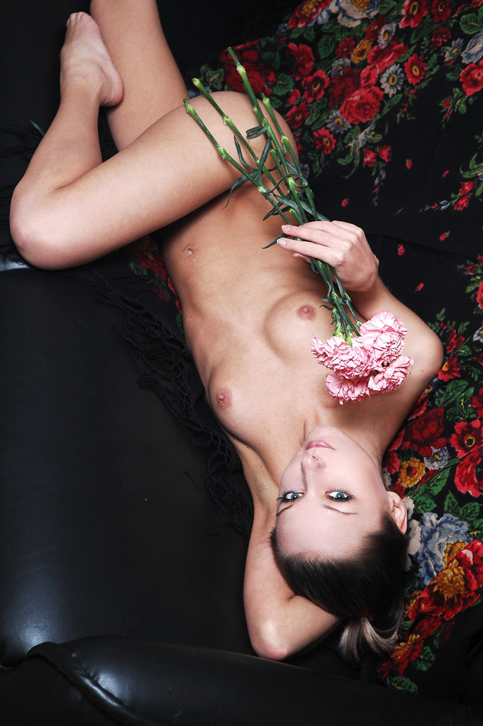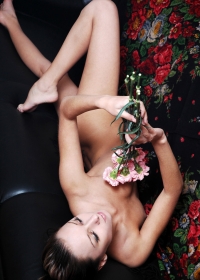 Entertaining hot babe with pussy wetting curves laying bare on bed full of scented flowers