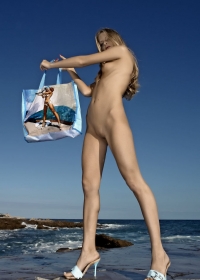 She leaves only her high heels on as this beauty gets naked shows her skinny, tight body at the beach.
