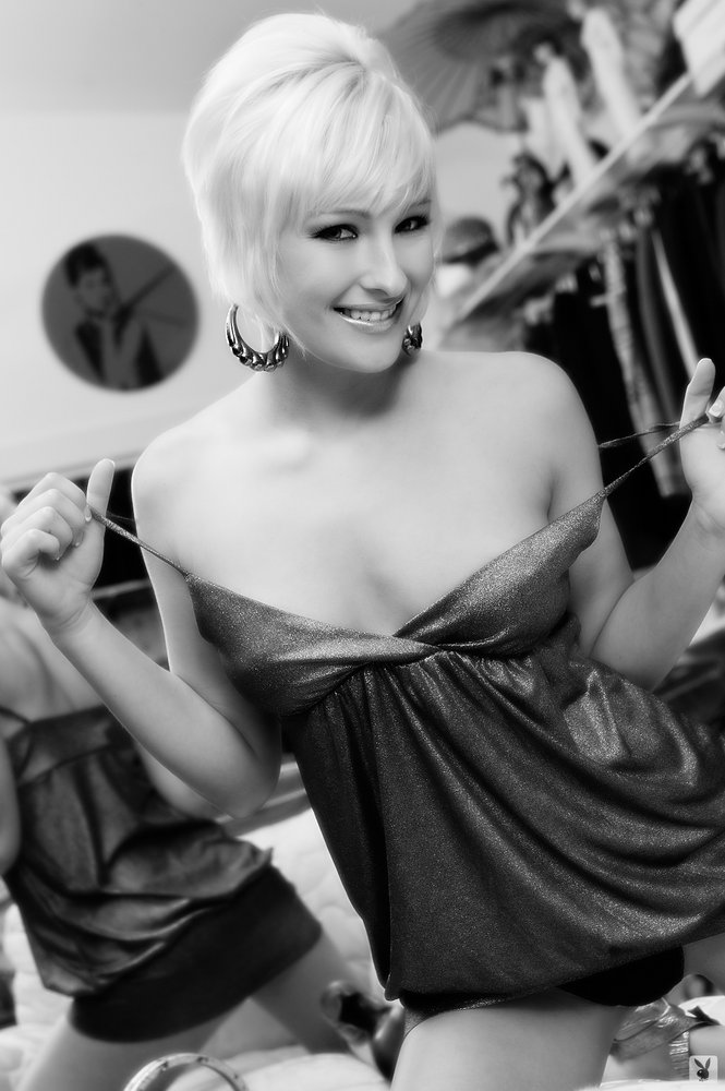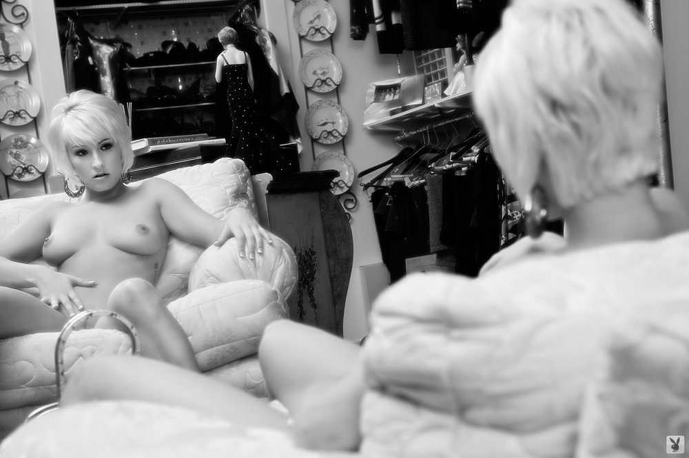 Playful blonde loves her body so much that she caresses it in front of a mirror.