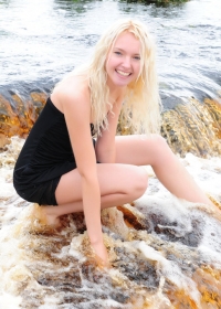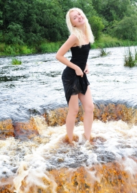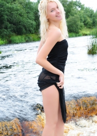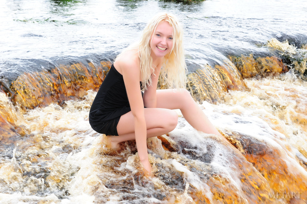 Playful teen babe plays at the river where she flaunts her sexy shaved vagina & laughs.