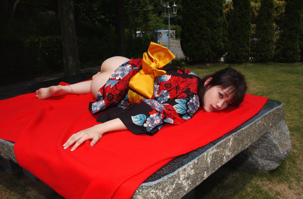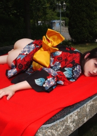 Yummy cute oriental girl takes off kimono to show round teen boobies in the garden and then poses nude at home