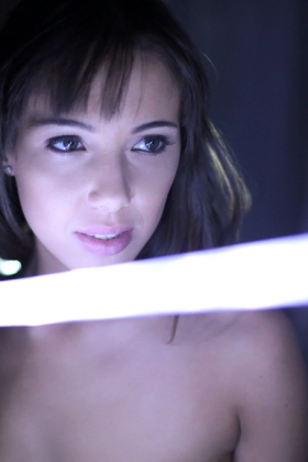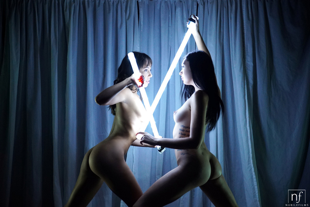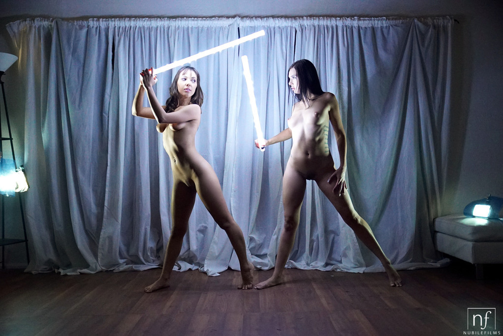 Two naked babes fight on lightsabers and later share a two-sided dildo in their bed