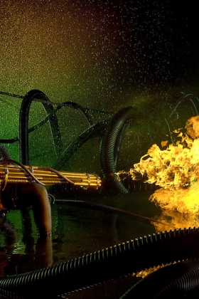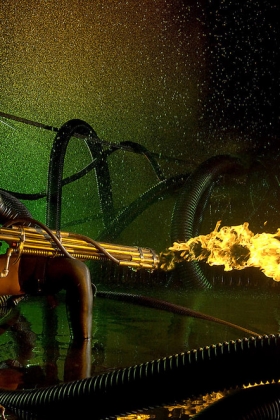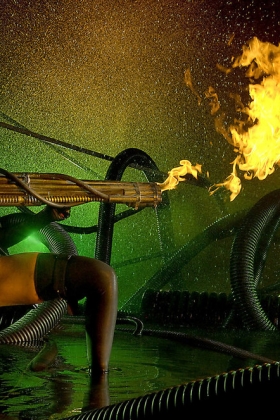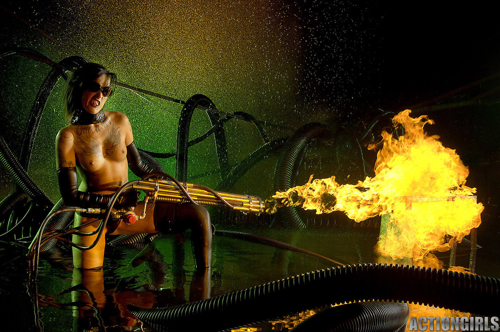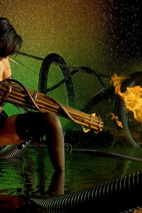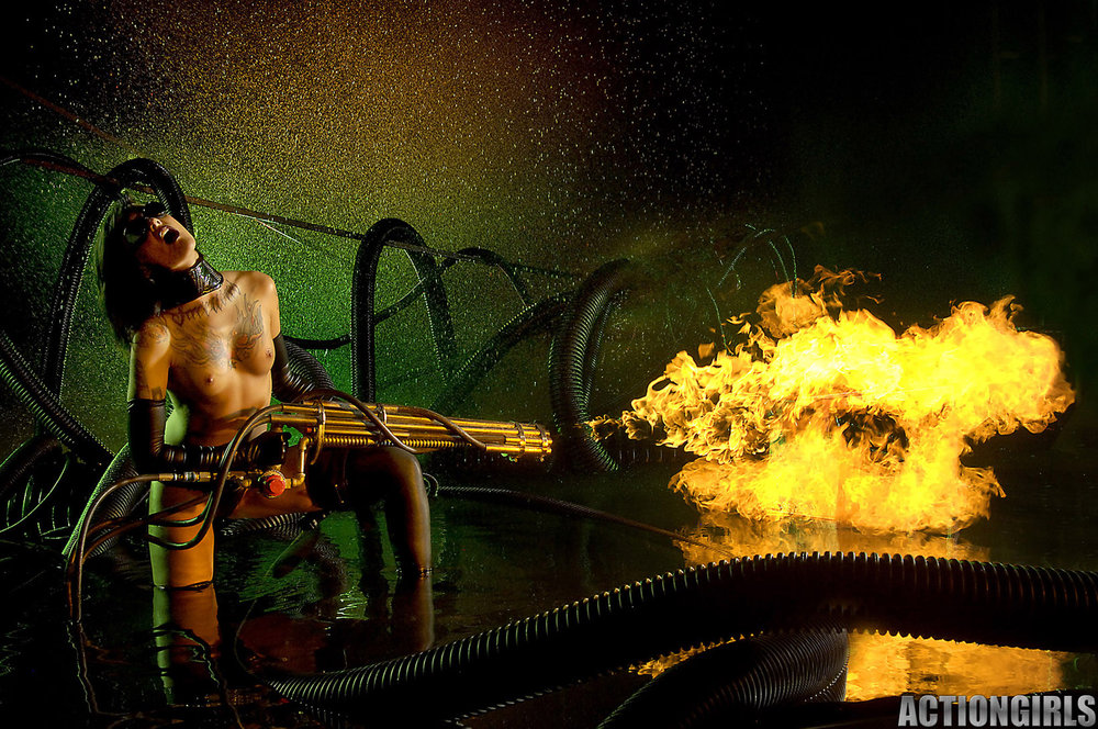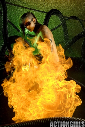 Awesome brunette wearing black lingerie is playing with fire and touching herself
