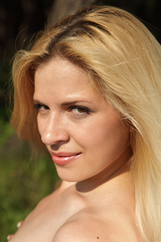 Curvy blonde enjoys a naked walk and poses for a photosession on green grass