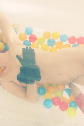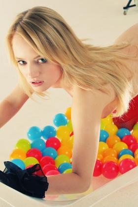 Stunning babe shows off her impressive body and poses next to colorful kids’ toy balls.