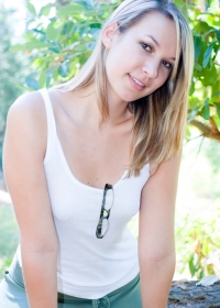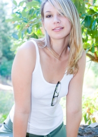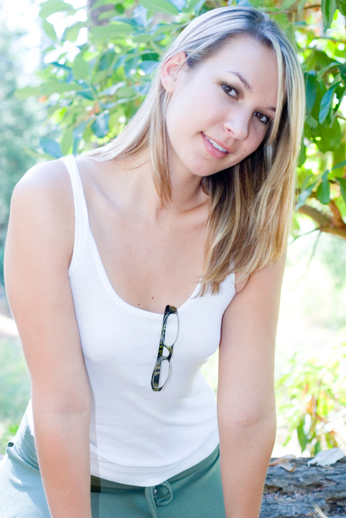 Passionate blonde wearing black glasses is taking off her lingerie and showing solo skills