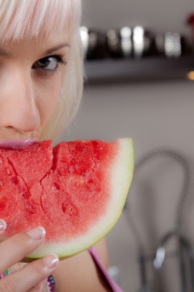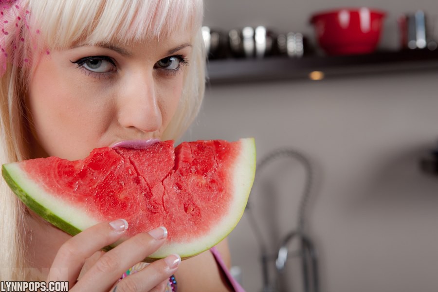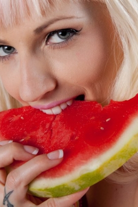 Fascinating female undressing elegantly and rubbing her sexy pussy with juicy water melon