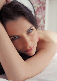 Teen beauty has her shaved pussy and big boobies shown in various poses.