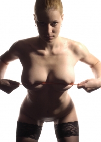 Busty blonde hottie poses in her favorite black stockings and teases her pussy with a string