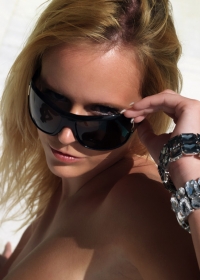 Lustful blonde with stylish sunglasses is sunbathing being absolutely naked