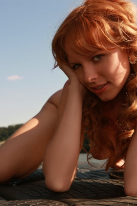 Red-haired babe takes different positions on the pier when she wants to pose on camera