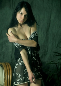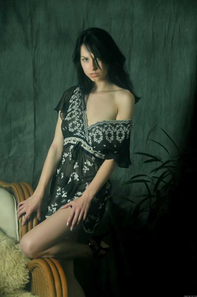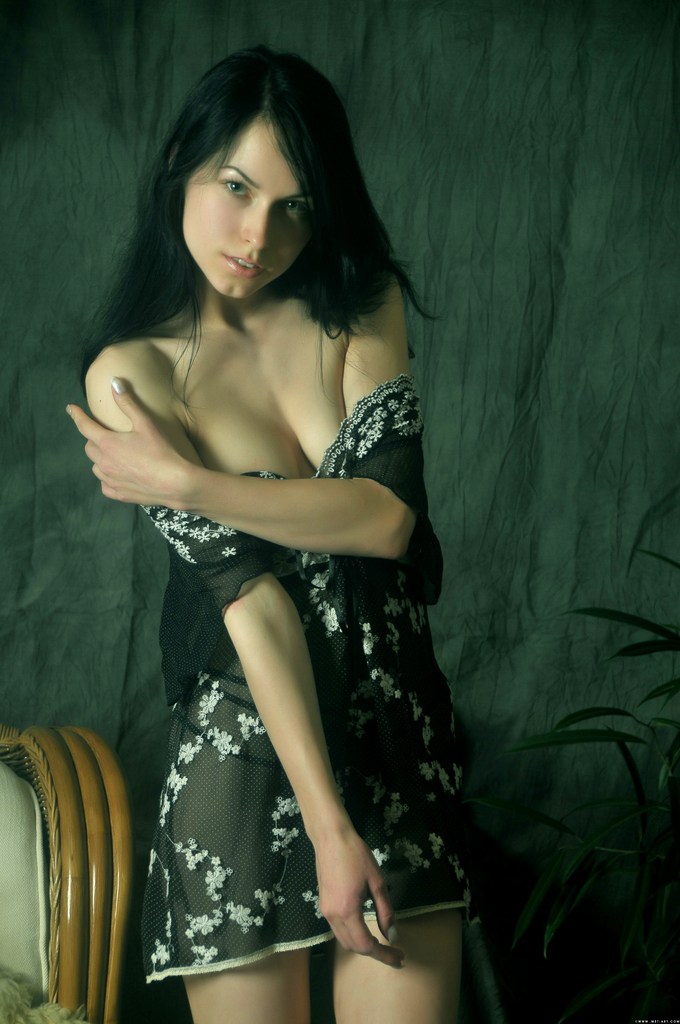 Skinny brunette plays with her big boobs, long legs, shaved pussy and firm butt